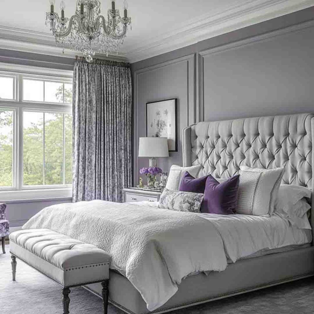 • Lavender + Light Grey: Lavender is known for its cool properties and when paired with light grey, it creates a space that feels both serene and sophisticated. This combination is perfect for a romantic and romantic vibe in your bedroom.