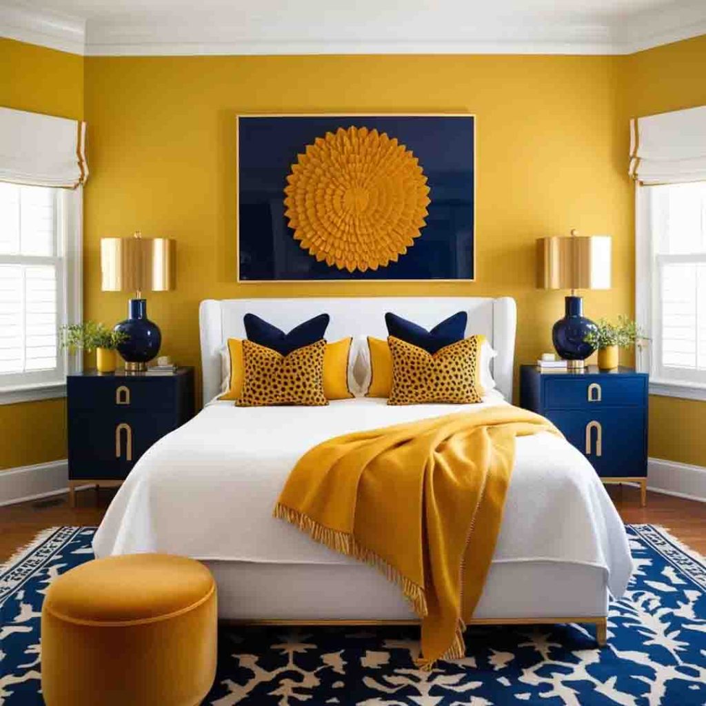 • Navy Blue + Mustard Yellow: For a modern and bold look combine deep navy blue with mustard yellow. The contrast between the dark blue and bright yellow creates an attractive sophisticated vibe that’s perfect for those who love color but don’t want to go overboard. This combination is ideal for a statement bedroom.