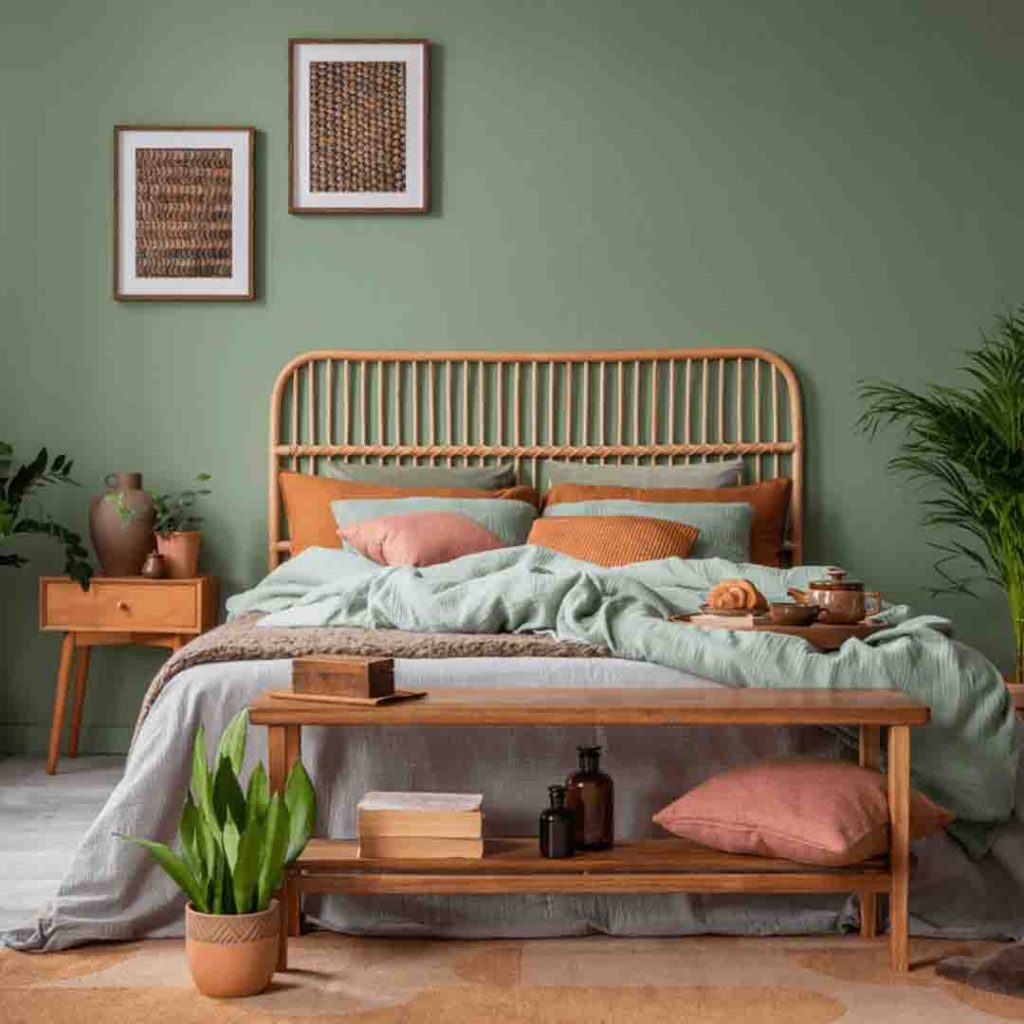 • Olive Green + Terracotta: Olive green serves as an earthy rich hue that matches perfectly with warm terracotta tones. This combination makes your bedroom inspired by a rustic nature and brings the outside of a cool grounded environment.