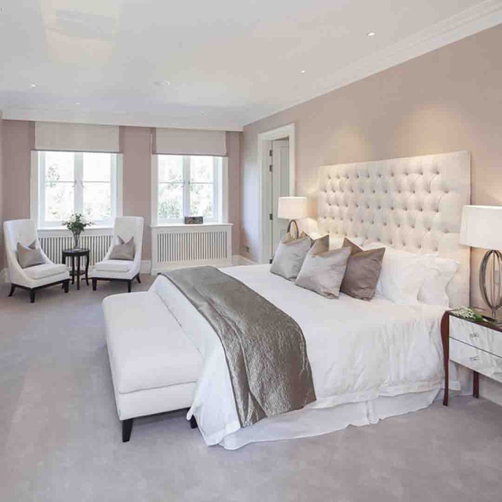 Soft, neutral tones like beige and dusty rose, sage green and off-white, or light blue and soft grey create a calming and relaxing bedroom environment. The selected colors establish an environment that generates calmness and serenity.