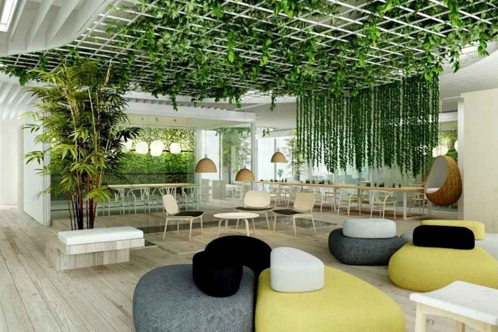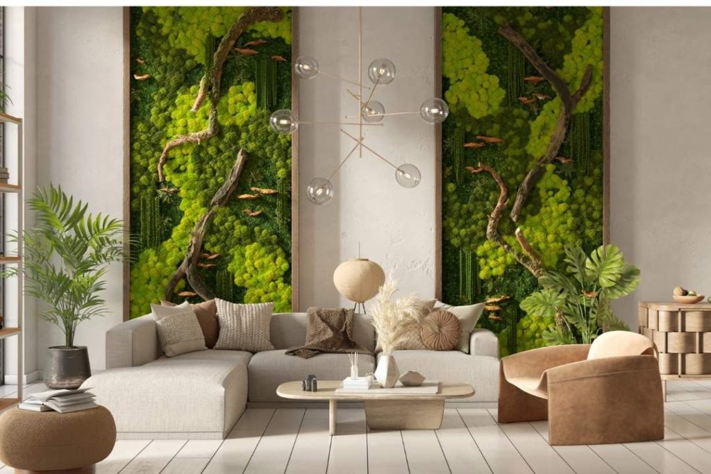 Biophilic design integrates nature into interiors through plants, green walls, natural materials, water features, and natural light. It reduces stress, improves air quality, and creates calming, refreshing spaces.